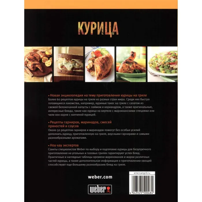 Weber книга рецептов блюд из курицы содержит в себе подробную информацию о приготовлении птицы на всех видах грилей. От техник и нюансов разжигания угля, предназначения аксессуаров и инструментов и других тонкостей до пошаговых рецептов с цветными изображениями, описывающими каждый этап приготовления.