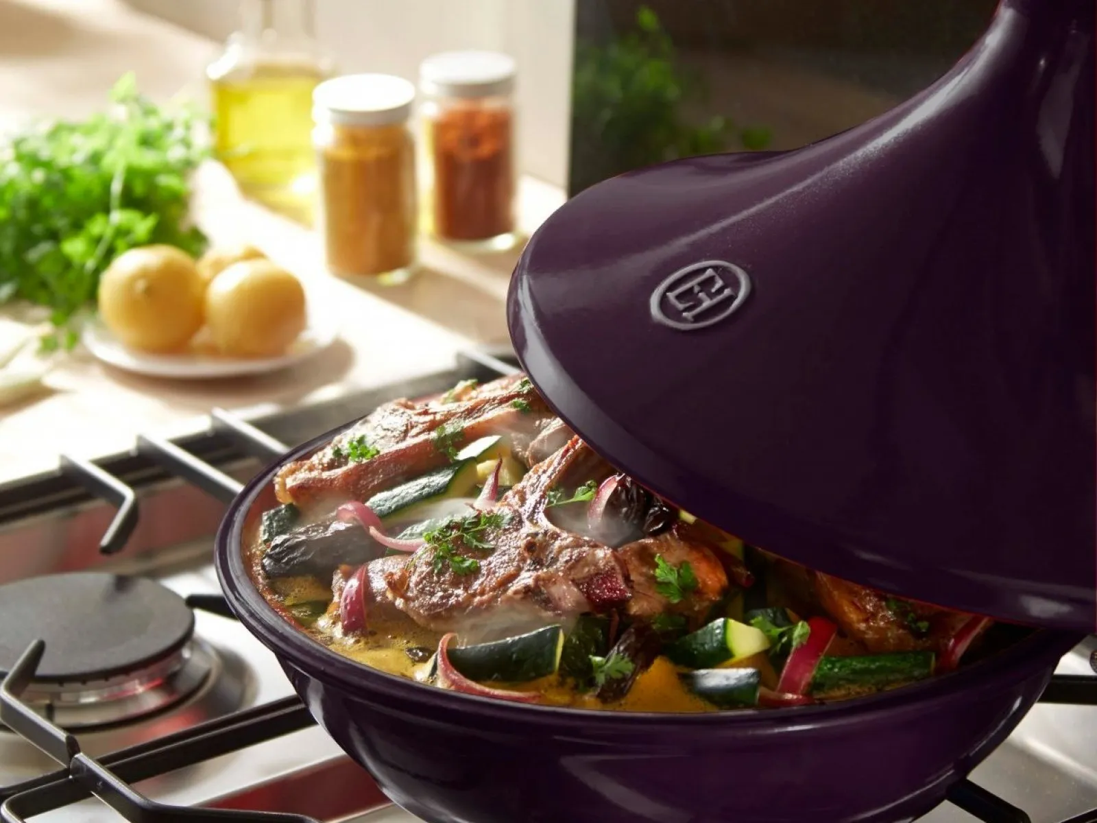 Благодаря конусообразной форме крышки, пар, поднимающийся от готовящегося блюда, многократно конденсируется в верхней ее части и спускается вниз, поэтому мясо, рыба и овощи становятся очень нежными и приобретают особый вкус. Позвольте легким и ароматным соблазнам увлечь вас: тажин из курицы с лимоном, тажин из морепродуктов, вегетарианский тажин… Доверьтесь интуиции и инстинктам, как это делают марокканцы, и создайте свой собственный рецепт тажина! 27-сантиметровый тажин рассчитан на 4-6 порций. Его можно помещать в духовку, в микроволновую печь и на любой источник прямого нагревания (на индукционный диск для индукционных плит). Как и любую другую продукцию Emily Henry, тажин можно помещать в посудомоечную машину, не боясь, что со временем он потеряет свой цвет.
