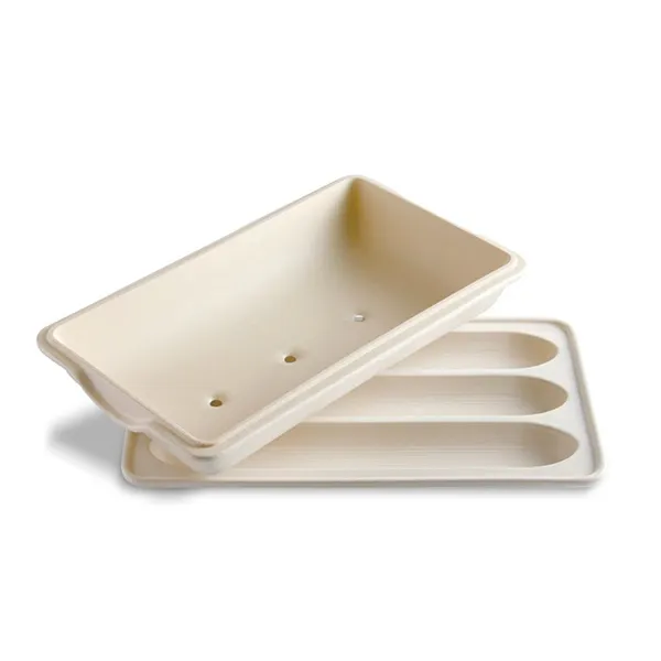 Приготовить настоящий французский багет — с хрустящей корочкой и воздушным ароматным мякишем — нет ничего проще для обладателя уникальной керамической формы Emile Henry. Форма для выпечки багетов Emile Henry изготовлена из высококачественной керамики. Изделие состоит из прямоугольной основы с тремя секциями для багетов и крышки с отверстиями.