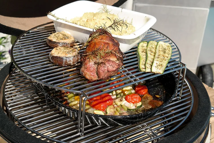 Подставка из нержавеющей стали для аксессуаров просто подвешивается на стальные ножки гриля Monolith, на подставку могут быть установлены решетки для гриля, отсекатели жара, а также другие аксессуары, например. Чугунная решетка или подставка для сковородки. Комплектующие и аксессуары теперь всегда под рукой.