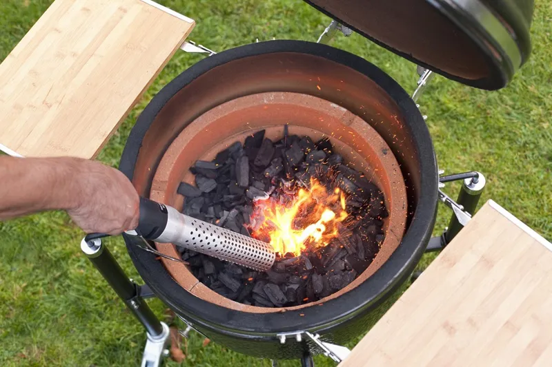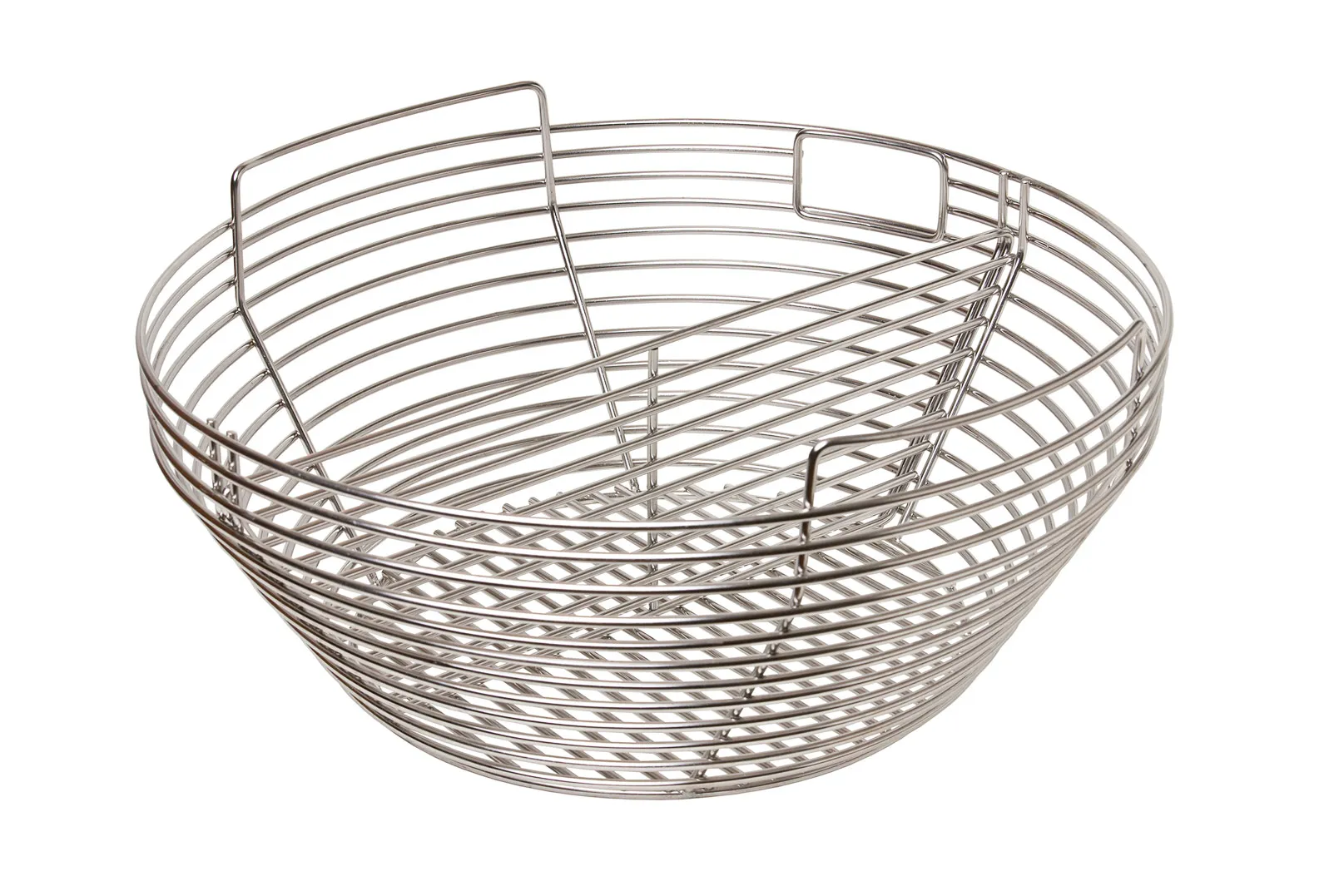 Корзина для угля из нержавеющей стали. Корзина сделана таким образом, что распределение воздуха значительно улучшается и в результате зола падает через решетку, так что засорение подачи воздуха предотвращается. Таким образом, зола может стряхиваться и корзина будет заполнена новым углем. Корзины для угля для монолитов CLASSIC и LE CHEF имеют сепаратор. Это дает возможность установить две различных температурных зоны в гриле.