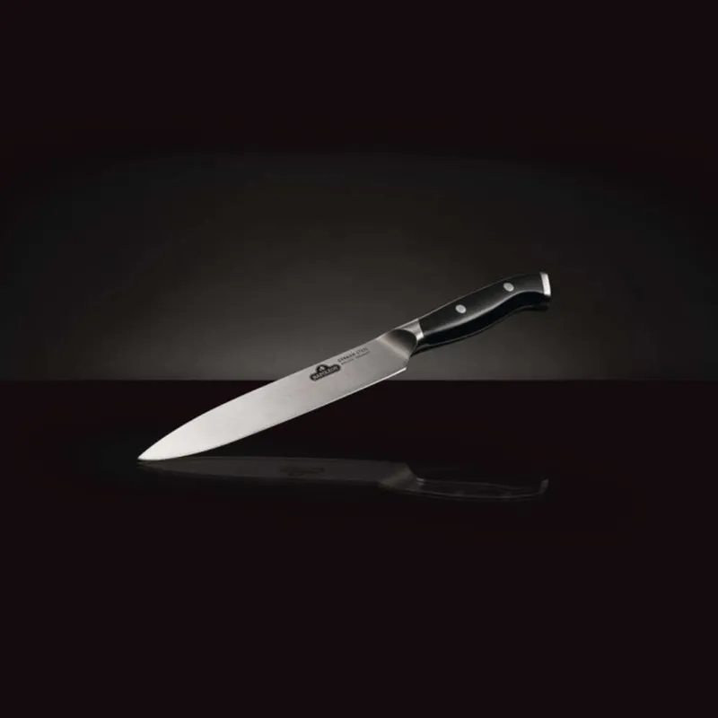 Лезвие этого ножа намного тоньше, чем у универсального ножа шеф-повара, что позволяет более тонко и аккуратно нарезать жаркое, ветчину и другое крупное приготовленное мясо.