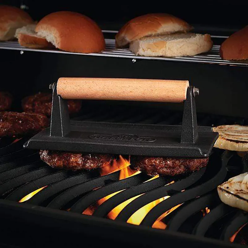 Чугунный пресс Napoleon идеально подходит для обжарки мяса и создания хрустящей корочки на продукте.
