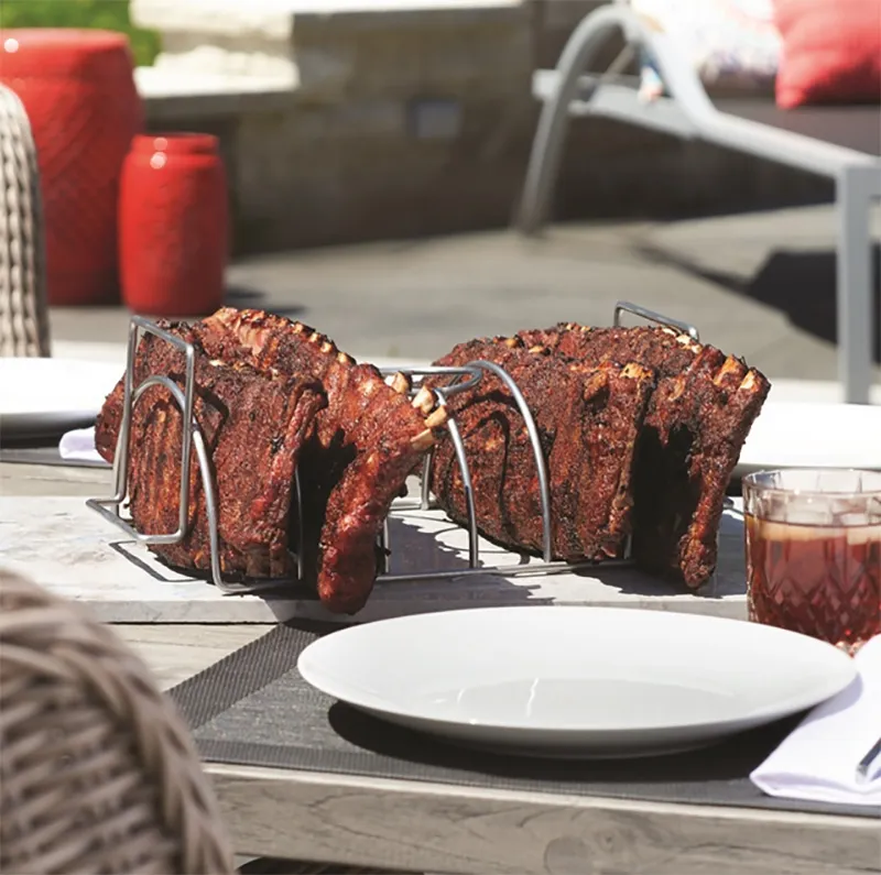 В этой подставке можно разместить большое количество стоек ребер. Приготовление в вертикальном положении снижает вероятность обугливания и обеспечивает больший поток воздуха для идеального количества дыма со всех сторон.