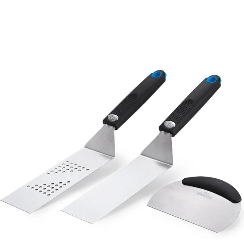 С этим набором столовых приборов для гриля, состоящим из трех частей, который идеально подходит для использования с планчами и пластинами для гриля, Вы легко сможете переворачивать и перемешивать блюда, благодаря большим, удобным лопаткам, одна из которых перфорированная и отлично подходит для гамбургеров и рыбы.