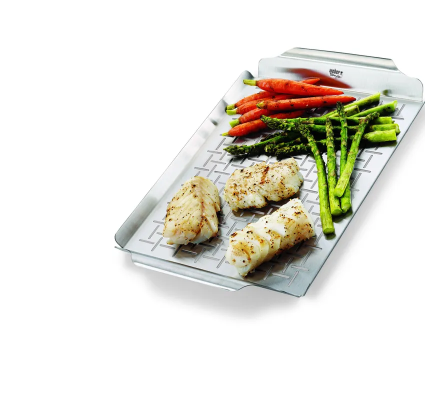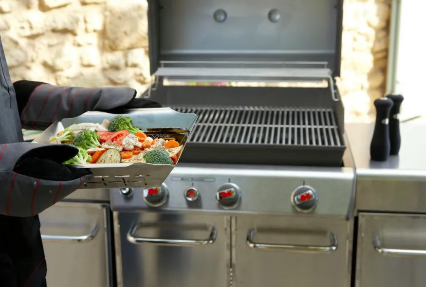 Нарежьте кубиками или кусочками овощи, положите в противень и поставьте на гриль во время приготовления основного продукта.