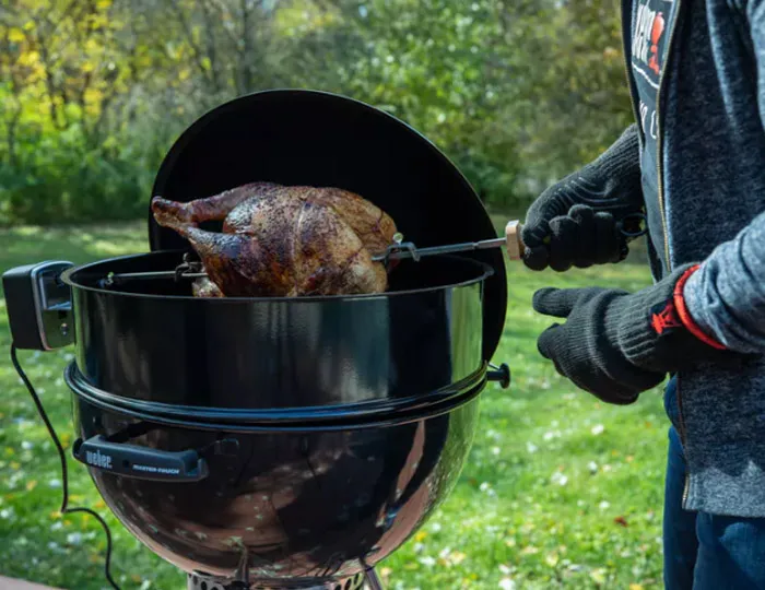 Специальный вертел для угольных грилей диаметром 57 см с регулируемыми вилочками для продуктов разного размера. Идеально подходит для птицы и крупных кусков мяса. Комплектуется электромотором.
