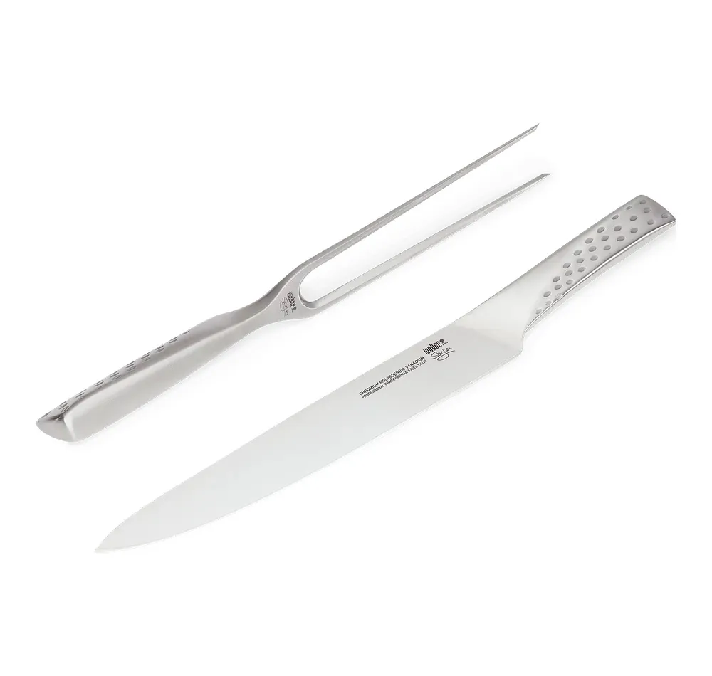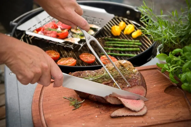 Нож для нарезки имеет длинное узкое лезвие и заостренный кончик, чтобы аккуратно прорезать мясо и отводить его от кости. Вместе с вилкой, предназначенной для удерживания мяса, набор для нарезки станет отличным дополнением к вашим аксессуарам для гриля.