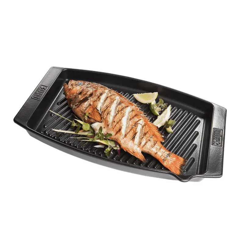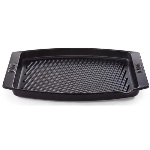 Керамический противень отлично подходит для приготовления на гриле и подачи блюд из рыбы, мяса и овощей. Также он удобен для жарки мелких продуктов, которые могут упасть вниз через решетку. Ребристое дно противня идеально подходит для создания рисунка, а специальный выступ на бортике позволяет удобно сливать лишний жир, соки или соус.