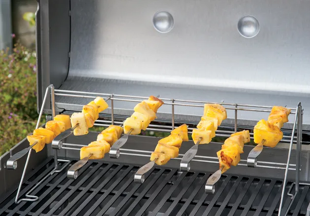 - Позволяет приготовить дополнительные закуски во время приготовления основного блюда. Пока мясо или рыба обжариваются на нижнем уровне, Вы можете приготовить овощные или фруктовые шашлычки с помощью Системы ETGS